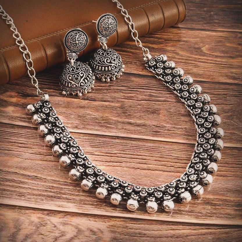 Embrace the timeless allure of our Radiant Oxidized Choker Necklace, a stunning piece that beautifully blends traditional craftsmanship with modern aesthetics. This exquisite necklace features intricate oxidized metalwork, creating a captivating and vintage-inspired design. Perfect for any occasion, it adds a touch of elegance to both casual and formal outfits. The adjustable chain ensures a comfortable fit, making it a versatile addition to your jewelry collection. Elevate your style and make a statement with this unique choker that echoes the beauty of cultural artistry.